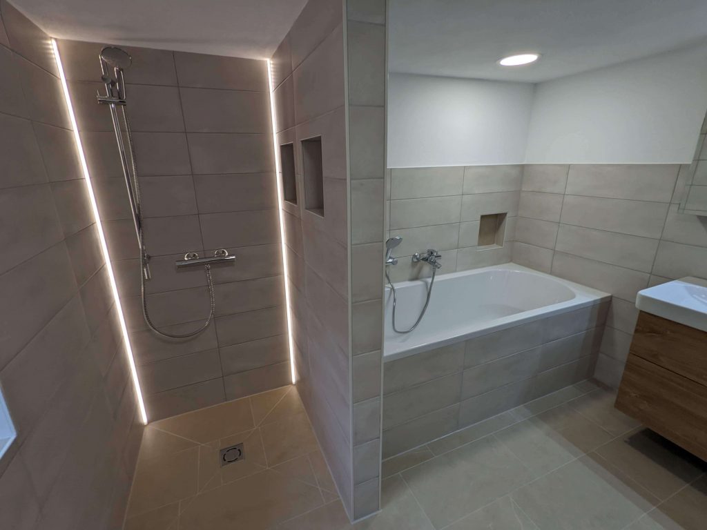 Neben in allen Formen, Farben und Dekors verfügbaren hochwertigen Fliesen setzen viele Wohnungseigentümer auf fugenfreie Wände oder Böden. Mithilfe großformatiger Platten beziehungsweise Paneele gestalten wir ausgesprochen edel wirkende, hygienische und pflegeleichte Oberflächen. Am Ende der Komplettrenovierung übergeben wir Ihnen ein vollständig saniertes, geprüftes und gereinigtes Badezimmer.